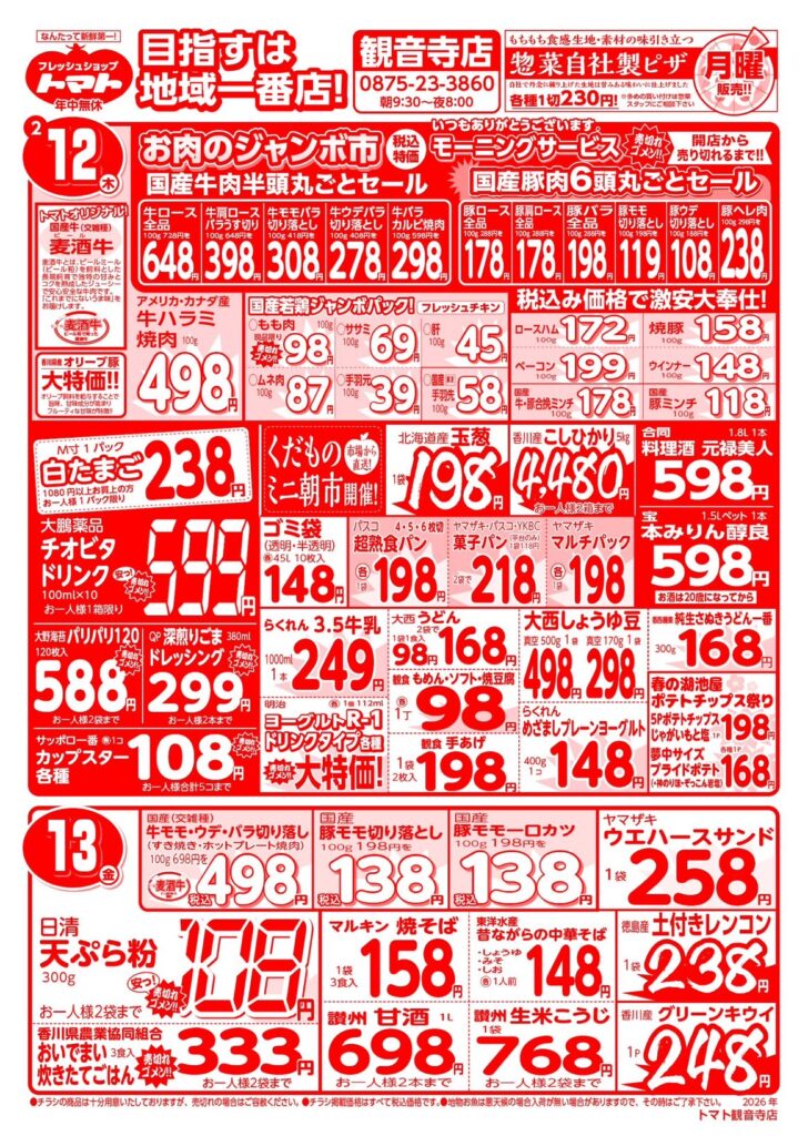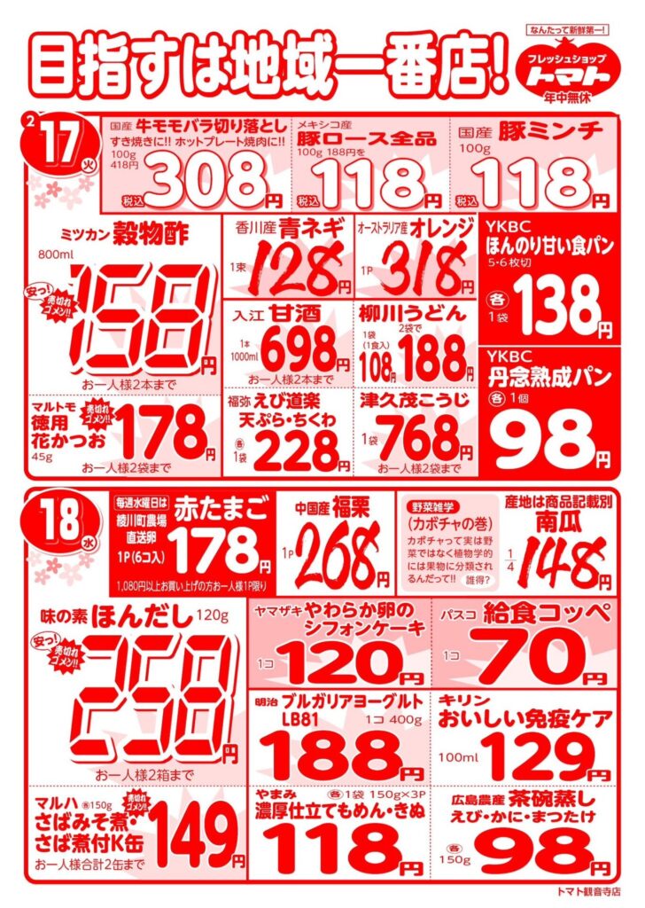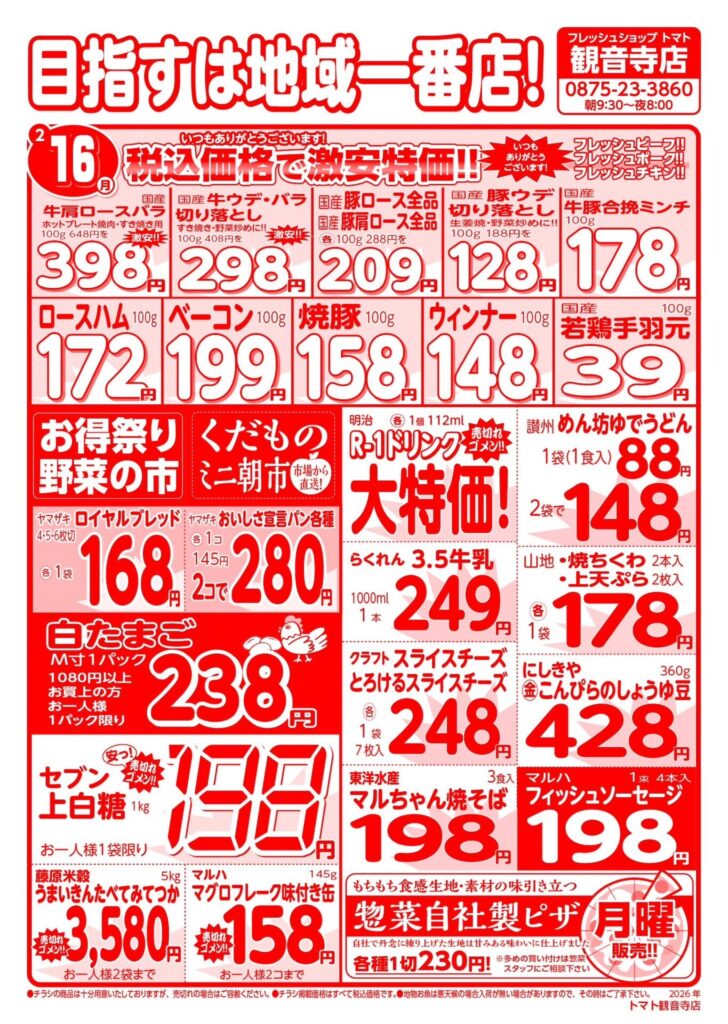 2/12~2/18の広告 2026 2/11 チラシ最新!! 2026年2月11日 2026年2月11日 チラシ最新!! よかったらシェアしてね! URLをコピーしました! URLをコピーしました! 2/5~2/11の広告 この記事を書いた人 fs-tomato 関連記事 2/5~2/11の広告 2026年2月4日