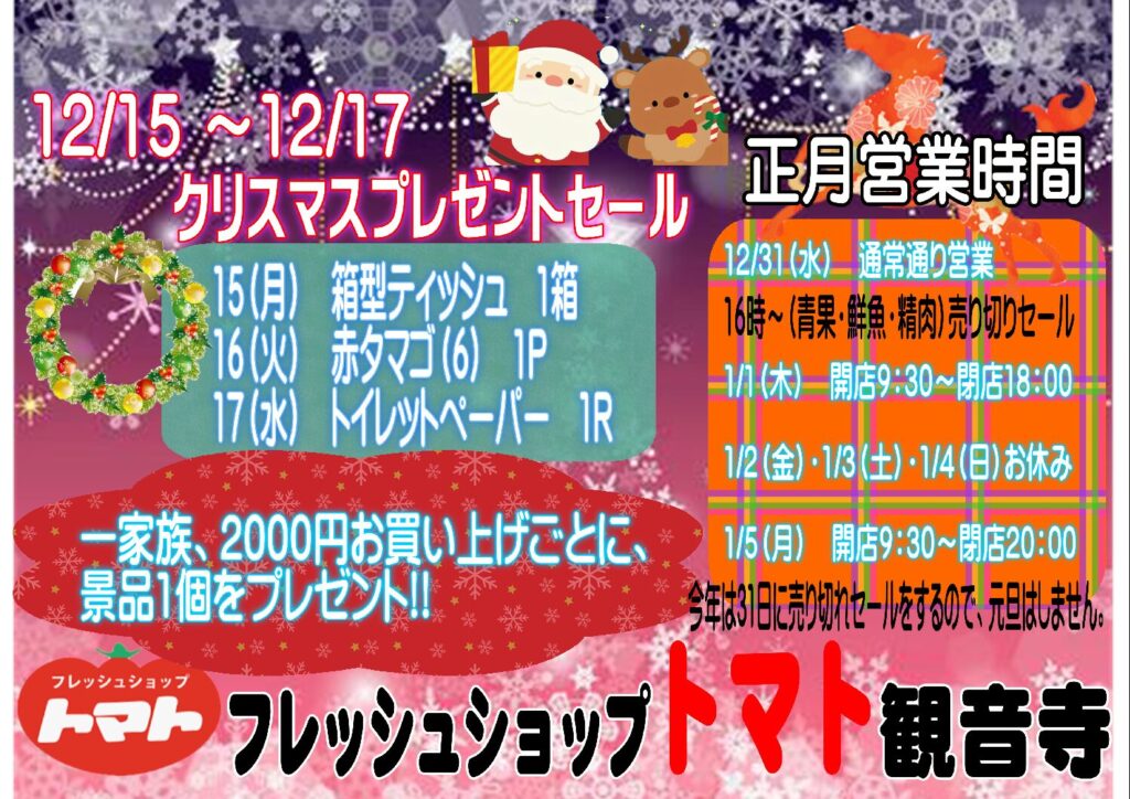 クリスマスプレゼントセール 期間:12/15(月)~12/17(水)・15日 箱型ティッシュ 1箱・16日 赤たまご(6) 1P・17日 トイレットペーパー 一家族、2000円以上お買い上げごとに、景品1つプレゼント!! 12月31日16:00~閉店まで売り尽くしセール毎...